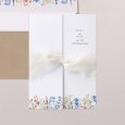 This model comprises an invitation and an evening invitation to slip inside. There are perforations for threading through a pretty ribbon (optional extra) with a tag, the little detail that makes all the difference.