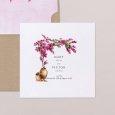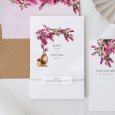On the Bougainvillée wedding invitation, the superb, shimmering shrub of the same name stands out above the first names of the bride and groom, a gentle nod to a future summer wedding celebrated in the Mediterranean.
