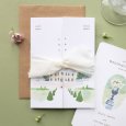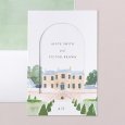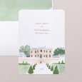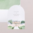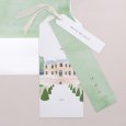 This invitation comes in the form of a portrait card, with a central flap and two movable side flaps. When opened, they reveal the key details of your special day. Accessorize with a pretty ribbon (available at extra cost).