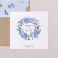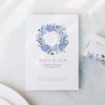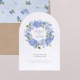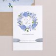 The classic floral theme is given a modern twist on the Hortense wedding announcement. A superb wreath of flowers in shades of blue can be seen on this design, perfect to set the tone for a colourful, chic country wedding.